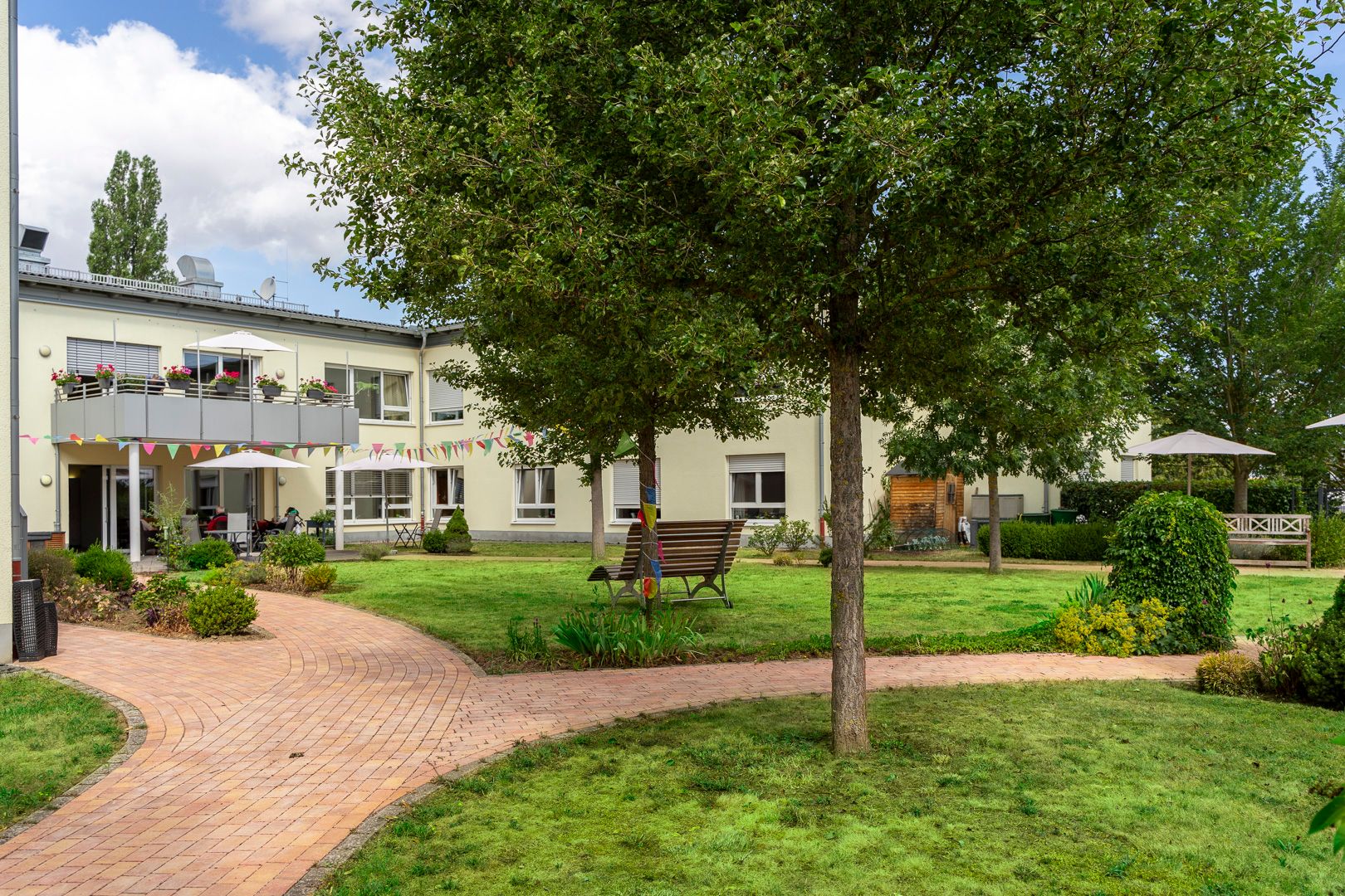 Umgeben ist unsere Einrichtung von einem liebevoll gestalteten Garten, in dem unsere Bewohner:innen und ihre Gäste spazieren gehen, Kaffee trinken, ein Buch lesen oder einfach die Sonne genießen können.